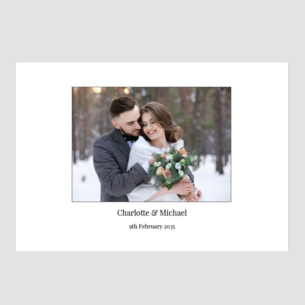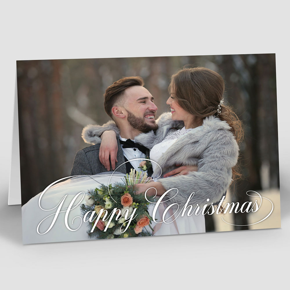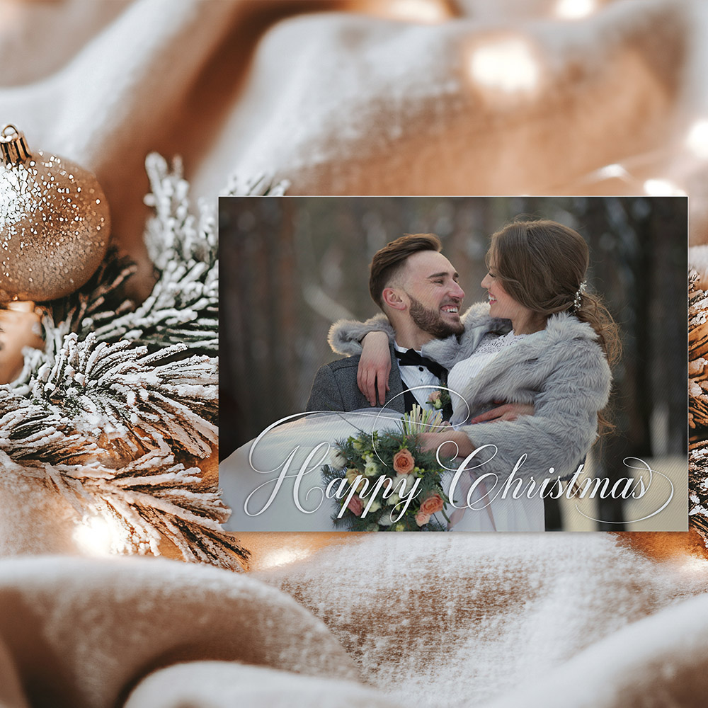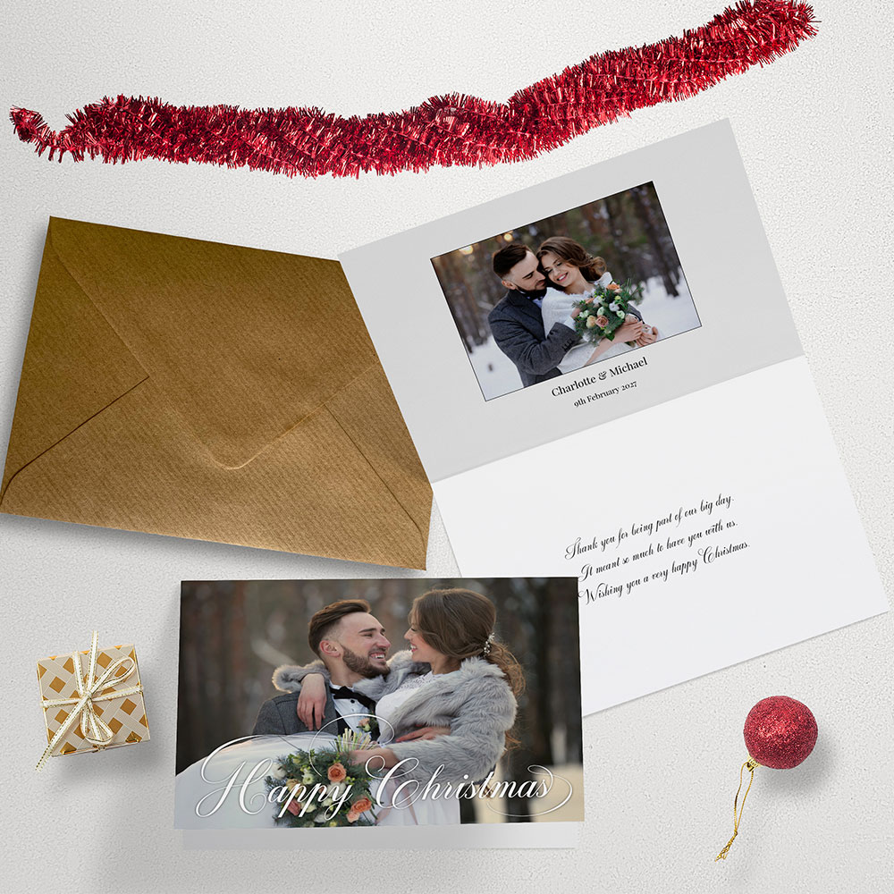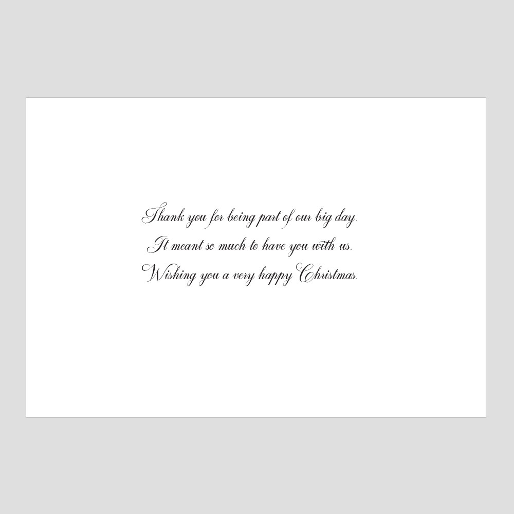 This lovely Christmas themed wedding thank you card is simple and classic. Featuring a single photograph on the front with various formats available on the inside of the card. Format: Folded Rectangle